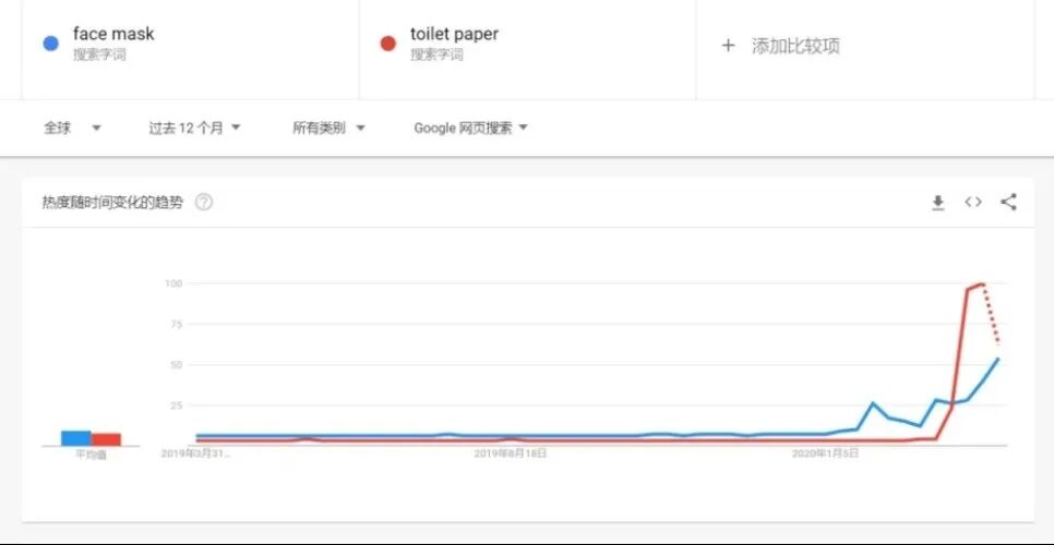 国外疫情爆发,从Google Trends可以看到,从2月份左右,厕纸热度大量递增,有谁想到厕纸有一天也会被疯狂抢购?