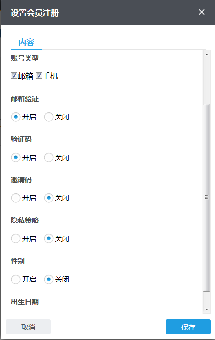 开启功能即意味着该功能将展示在注册页面上,作为客户注册网站会员的必填项,此处需注意,手机注册仅针对中文网站。