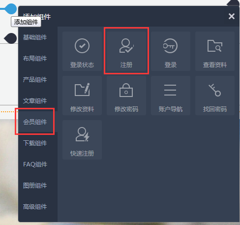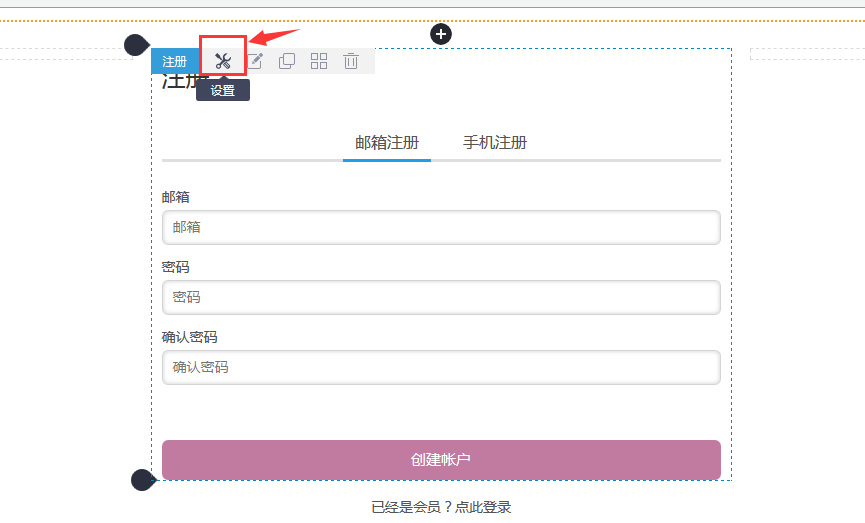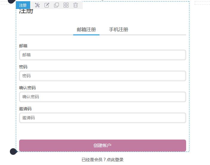 注册组件可以实现会员注册功能,支持邮箱注册或手机注册(手机注册仅针对中文网站)。